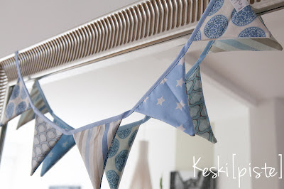 Lähes identtinen viirinauha kuin yllä, vain yksi kangas on vaihtunut toiseen. :) Pituutta tälläkin nauhalla n. 240cm ja viirejä 13kpl.